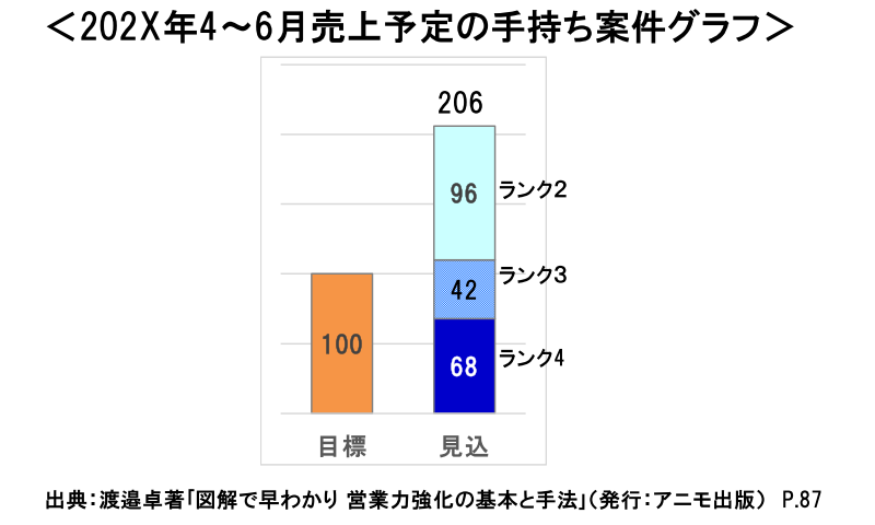 案件管理で大変なのは、案件一覧表を一度作っても、状況が刻々と変わることです。リーダーが営業員と毎週、案件をどうやってランクアップするか作戦会議を行います。営業員が顧客と商談することで、進捗度ランクや売上予定日が変わります。その結果を集計すると、ランク別に手持ち案件グラフができて、目標に対してどれだけ不足しているのか明確になります(下図)。