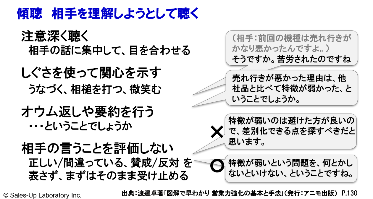 相手の発言を評価しないことです。正しい/間違っている、賛成/反対をすぐに示さず、まず受け止めます。つい「それはいいね」と言ってしまいがちですが、これは評価や賛否の表明になっています。