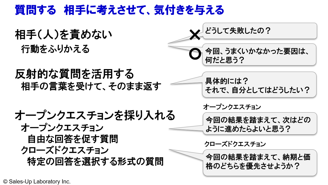 傾聴の次に重要なスキルが、質問です。上司が答えを教えるのではなく、部下自身に考えさせる質問を行います。